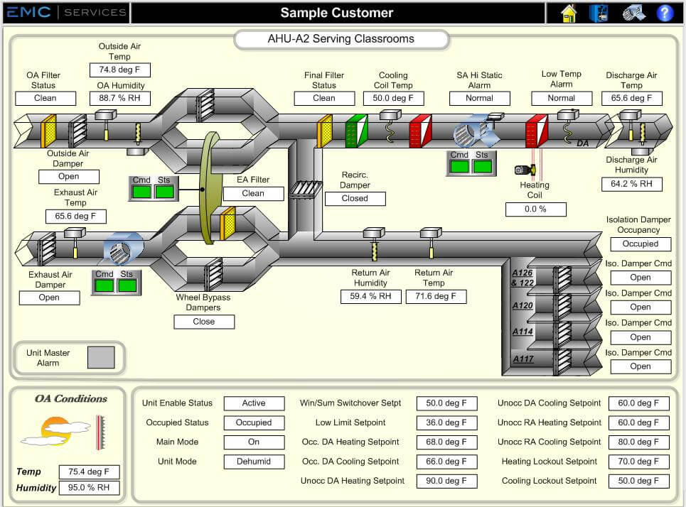 The graphics for a building control system are often the only thing a building operator will look at to diagnose and troubleshoot his building. That's why EMC Services has invested in a Graphics Department to generate graphical drawings and pictures for viewing a building's mechanical systems. Our separate department for graphics allows the details of the graphics a priority. Our team has focused on improving the visual representations of the systems.
